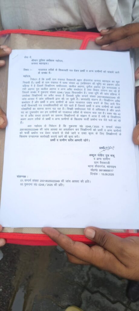 कैसरगंज (बहराइच)। ग्राम पंचायत बैराकाजी के ग्रामीणों ने सोमवार को पुलिस अधीक्षक बहराइच को एक शिकायती पत्र सौंपा। ग्रामीणों का आरोप है कि विपक्षी पक्ष द्वारा लगातार झूठी और मनगढ़ंत शिकायतें की जा रही हैं, जिससे उन्हें मानसिक और सामाजिक दोनों स्तरों पर परेशानियों का सामना करना पड़ रहा है। ग्रामीणों ने बताया कि जब भी वे अपनी बात उच्च अधिकारियों तक पहुंचाते हैं या न्याय की गुहार लगाते हैं, तब विपक्षी पक्ष दबाव बनाने के लिए नए-नए आरोप लगाकर फर्जी मुकदमे दर्ज कराने का प्रयास करता है। इस पूरे मामले को लेकर ग्रामीणों में आक्रोश और असंतोष की स्थिति बनी हुई है। उनका कहना है कि यदि समय रहते प्रशासन ने इस पर कड़ा कदम नहीं उठाया तो यह विवाद और गहरा सकता है। कैसरगंज कब्रिस्तान विवाद और वक्फ भूमि पर अवैध कब्जे का यह मामला अब केवल एक कानूनी लड़ाई नहीं रह गया है, बल्कि ग्रामीणों के सामाजिक जीवन और उनकी प्रतिष्ठा का भी प्रश्न बन गया है। इस तरह की स्थिति में बैराकाजी ग्राम पंचायत के लोगों ने प्रशासन से निष्पक्ष और पारदर्शी जांच की मांग की है।